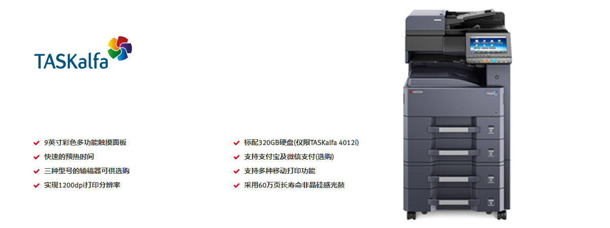 TASKalfa 4012i分別具備每分鐘40頁的黑白輸出能力,預熱時間僅需18秒。標配復印、打印、彩色掃描功能,選購傳真功能。1200dpi的打印分辨率搭配60萬頁長壽命感光鼓,為日常辦公中的質與量提供雙重保障