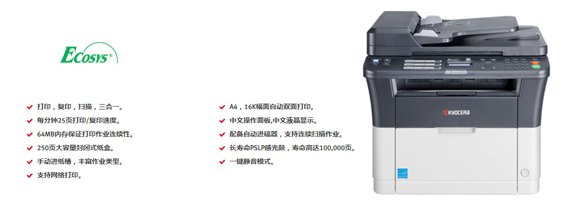 品牌:京瓷類型:黑白速度:25張/分幅面:A4功能:打印/復印/掃描/雙面租期:三年
